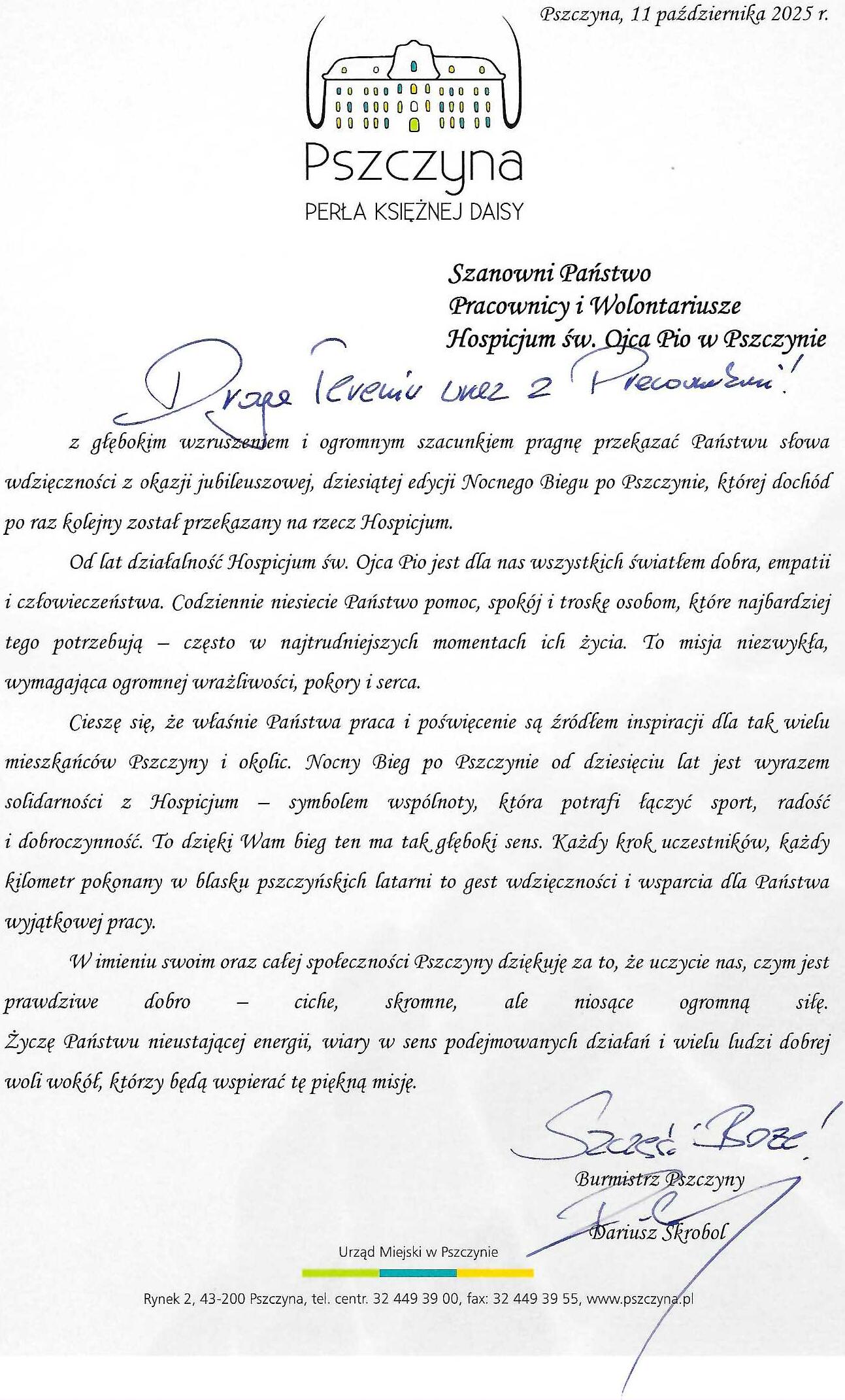 W Światowy Dzień Hospicjów i Medycyny Paliatywnej 2025 na starcie 10. jubileuszowego Nocnego Biegu po Pszczynie dla Hospicjum stanęło ponad 789 zawodników. Dochód z imprezy przyniósł ponad 77 tysięcy złotych na działalność hospicyjną – zapewnienie profesjonalnej pomocy osobom chorym, cierpiącym i ich najbliższym.